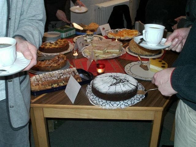 bei Kaffee, Limo, Kuchen und Schnittchen aus.
